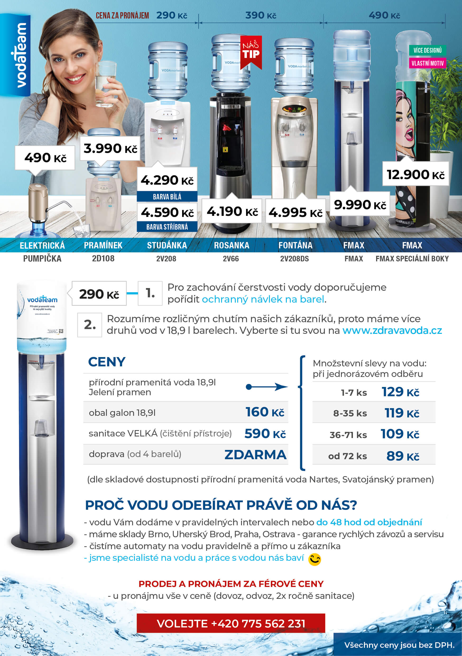 Pořiďte si výdejník vody, díky kterému si můžete vychutnat čistou a osvěžující vodu kdykoliv potřebujete, a to jak chlazenou, pokojovou, tak i horkou, což oceníte nejen při běžném pitném režimu, ale i při přípravě čaje nebo kávy. V kombinaci s naším pravidelným rozvozem vody ve vratných barelech (18,9 l) máte vždy zajištěn stálý přísun kvalitní pramenité vody bez starostí. Díky ekologickým vratným barelům navíc šetříte životní prostředí a eliminujete plastový odpad.
